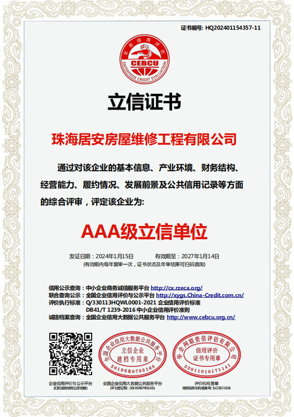 珠海居安房屋維修工程有限公司成立于2020年,是一家專注房屋維修的公司。我們擁有各類型專業(yè)人才,業(yè)務(wù)包括老舊建筑翻新改造、外墻空鼓修復(fù)、防水幕墻養(yǎng)護、外墻預(yù)置構(gòu)件拆除更換、供排水管網(wǎng)改造、墻面翻新、鋼制結(jié)構(gòu)建筑構(gòu)建及折除,外墻清洗及裝修裝飾。